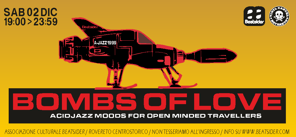 BOMBS OF LOVE propone le atmosfere londinesi degli anni d’oro dell’acidjazz ma, rispetto ad altri tipi di approfondimento culturale proposti da Beatsider e molto più facilmente circoscrivibili, BOMBS OF LOVE ripropone al meglio e con briglia molto sciolta l’attitudine superfree che ha dato vita e sviluppato negli anni il concetto di acidjazz, ovvero una commistione totale di influenze e sottogeneri riconducibili ai generi base su cui è idealmente fondato il movimento acidjazz, ovvero: jazz, soul, funk, latin, bossa, rnb.