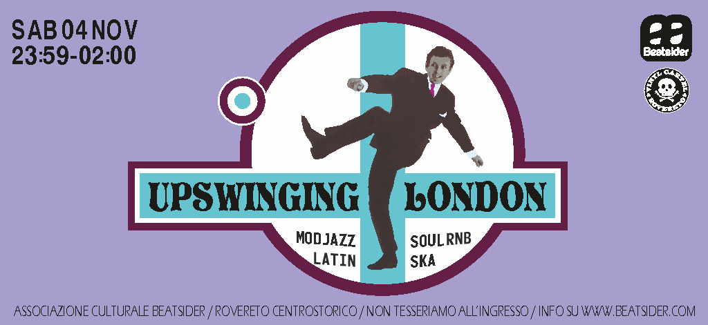 A seguire, fino alle 02:00, UPSWINGING LONDON, una selezione ragionata di vinili attinenti a peculiari scene cocktail londinesi degli anni sessanta, flambata anche con nuovi ritmi in arrivo dai caraibi.