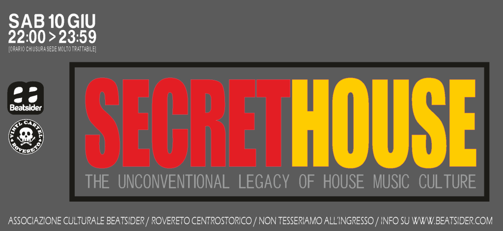 SECRETHOUSE grazie a una attenta, curiosa e sperimentale selezione di vinili lontani dal mainstream tesse una complessa trama ritmico melodica, che proietta sfumature di quella che possiamo intendere come una sorta di eredità lasciata dalla original house music culture. Partendo da impostazioni house seguiremo l’evoluzione e il continuo shakeraggio multiculturale del sound, con particolari favoritismi in fase di selezione a favore dei seguenti dipartimenti house: deep, minimal, tropical, brazilian, afro, latin e, ovviamente… più jazz c’è e meglio è!