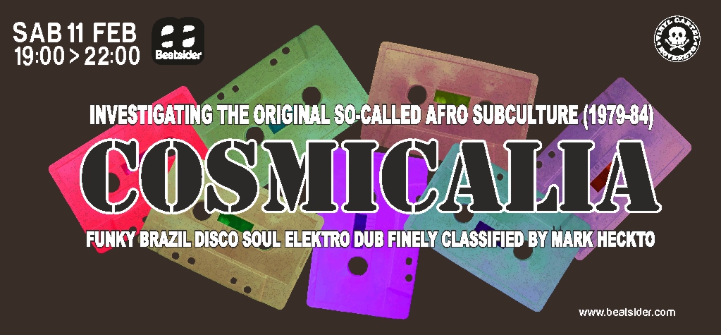 A breve comunicheremo anche le prossime date di COSMICALIA, in occasione delle quali avremo modo di mettere particolarmente a fuoco anche altri versanti della sottocultura Afro (deejays, le varie serie di cassette, adesivi, vespe, squali e quant’altro).