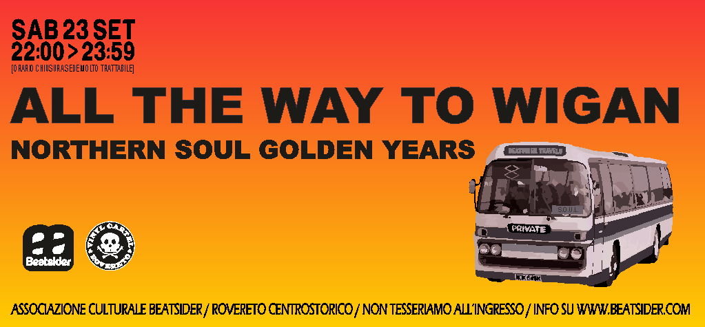 L’approfondimento culturale ALL THE WAY TO WIGAN è un tributo all’epopea degli all-nighter del Wigan Casino, la sala da ballo capace di catalizzare soulies da tutto il nord, e non solo, dell’Inghilterra fra il 1973 e il 1981 generando una sottocultura che si nutriva di vinile raro, o quantomeno al momento ancora sconosciuto. Questa febbre da vinile esclusivo è il motivo che spingeva i deejay dell’epoca a mascherare i titoli dei brani in modo da essere gli unici a suonare un dato pezzo per qualche settimana. Negli anni settanta se c’era del Soul nelle classifiche UK era prevalentemente materiale uscito da casa Motown ma al Wigan Casino i dischi per essere scelti e suonati dovevano essere necessariamente sconosciuti, e non rimanevano nelle borse dei deejay per più di 3-4 settimane.