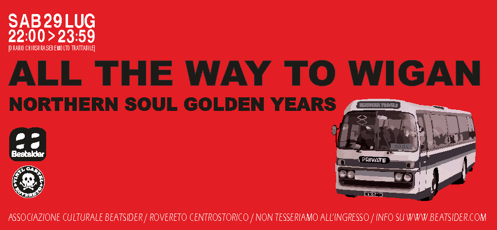 L’approfondimento culturale ALL THE WAY TO WIGAN è un tributo all’epopea degli all-nighter del Wigan Casino, la sala da ballo capace di catalizzare soulies da tutto il nord, e non solo, dell’Inghilterra fra il 1973 e il 1981 generando una sottocultura che si nutriva di vinile raro, o quantomeno al momento ancora sconosciuto. Questa febbre da vinile esclusivo è il motivo che spingeva i deejay dell’epoca a mascherare i titoli dei brani in modo da essere gli unici a suonare un dato pezzo per qualche settimana. Negli anni settanta se c’era del Soul nelle classifiche UK era prevalentemente materiale uscito da casa Motown ma al Wigan Casino i dischi per essere scelti e suonati dovevano essere necessariamente sconosciuti, e non rimanevano nelle borse dei deejay per più di 3-4 settimane.