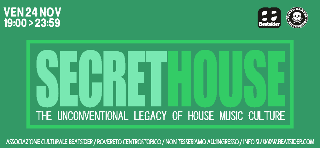 SECRETHOUSE grazie a una attenta, curiosa e sperimentale selezione di vinili lontani dal mainstream tesse una complessa trama ritmico melodica, che proietta sfumature di quella che possiamo intendere come una sorta di eredità lasciata dalla original house music culture. Partendo da impostazioni house seguiremo l’evoluzione e il continuo shakeraggio multiculturale del sound, con particolari favoritismi in fase di selezione a favore dei seguenti dipartimenti house: deep, minimal, tropical, brazilian, afro, latin e, ovviamente… più jazz c’è e meglio è!