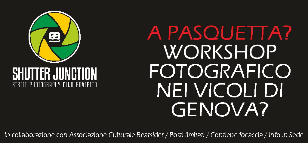 Ricordiamo che giovedì sera si chiuderanno le iscrizioni (gratuite) al workshop di fotografia che si terrà lunedì prossimo a Genova, nei vicoli, organizzato da SHUTTER JUNCTION, il laboratorio fotografico della Beatsider.